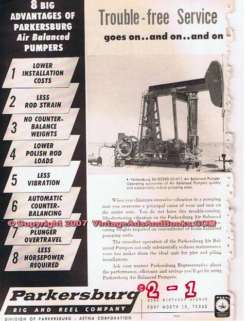 Original oil and gas trade magazine vintage ad for LINK-BELT COMPANY of Indianapolis, IN.  Houston, TX. Dallas, TX. Odessa, TX. and Los Angeles, CA.  For Severe Impact and Heavy Loads Link-Belt presents Mill Bearings. For use on Steel Mill, Foundry, Oil Drilling, Mining, Construction and other heavy-duty equipment. Unique 1955 old oilfield petroleum drilling industry equipment magazine advertisement. On the reverse side is an ad for PARKERSBURG RIG & REEL COMPANY of Fort Worth, TX.  Division of Parkersburg, Aetna Corporation. Pictured is a Parkersburg 84-G228D-22-N11 Air Balanced Pumper. Unique 1955 old oilfield petroleum pumping equipment industry magazine advertisement.