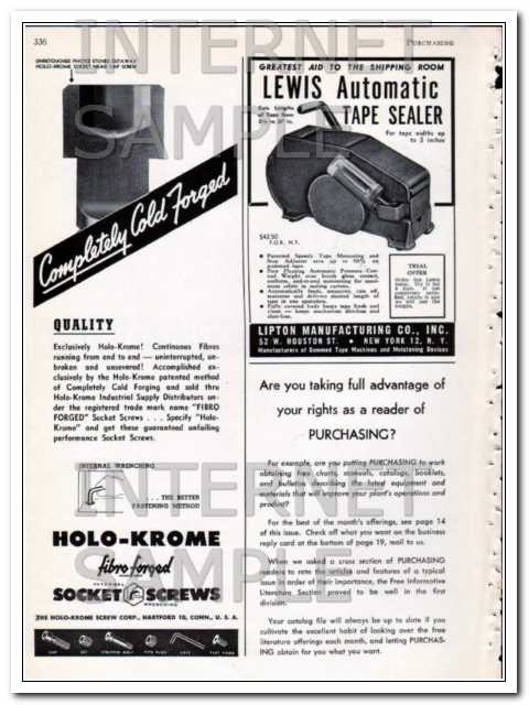 Original vintage industrial magazine ad for LIPTON MANUFACTURING COMPANY of New York, NY. Lewis Automatic Tape Sealer is the Greatest Aid to the Shipping Room. Manufacturers of Gummed Tape Machines and Moistening Devices. Old 1948 fractional page industry advertisement. Would display magnificently matted and framed!