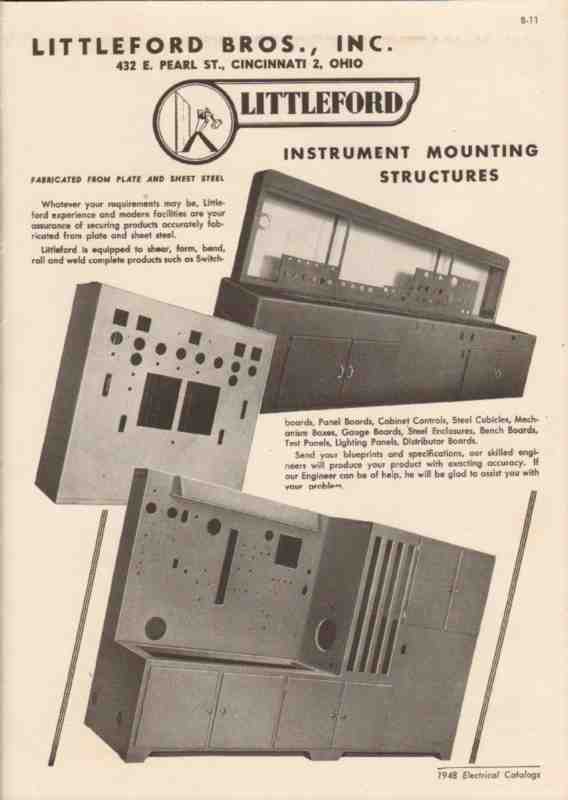 Original industrial trade vintage catalog for LITTLEFORD BROTHERS, INC. was located at 432 East Pearl Street, Cincinnati, OH. Manufacturers of Instrument mounting structures, fabricated from plate and sheet steel. Switchboards, panel boards, cabinet controls, steel cubicles, gage boards, lighting panels and more are manufactured. Disbound from a large 1948 industrial construction materials book, this unique old one page technical brochure would display wonderfully matted and framed. A marvelous addition to your retro industrial control equipment library.