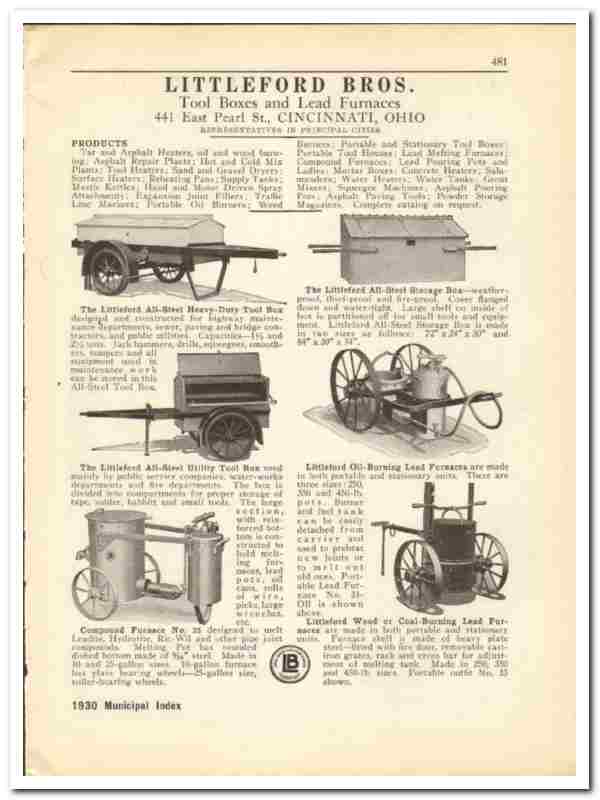 Products include the Littleford All-Steel Heavy-Duty Tool Box, Littleford All-Steel Utility Tool Box, Littleford All-Steel Storage Box, Compound Furnace Number 35, Littleford Oil-Burning Lead Furnace and Littleford Wood or Coal Burning Lead Furnace, all are fully featured.