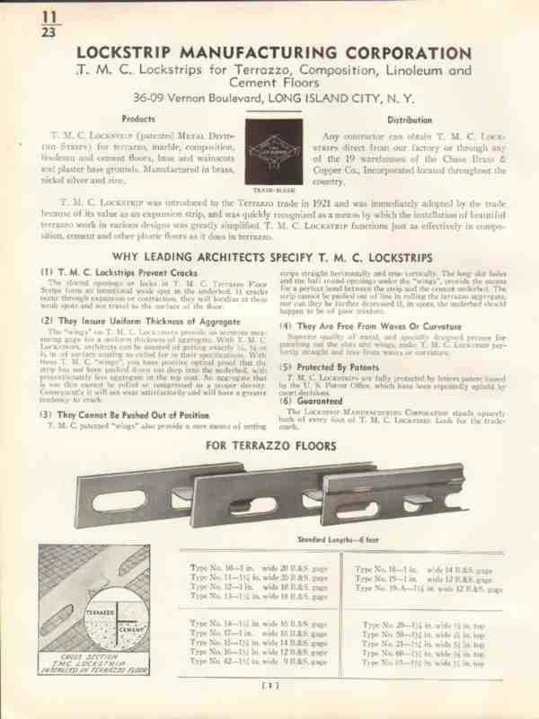 Original concrete trade vintage catalog for LOCKSTRIP MANUFACTURING CORPORATION, was located at 36-09 Vernon Boulevard, Long Island City, NY. Manufacturers of T.M.C. Lockstrips for Terrazzo, Composition, Linoleum and Cement Floors. Metal Dividing Strips manufactured in brass, nickel silver and zinc. Disbound from a large 1938 building material construction brochure, this unique old four page technical specification brochure would be a marvelous addition to your retro architecture design and engineering library.