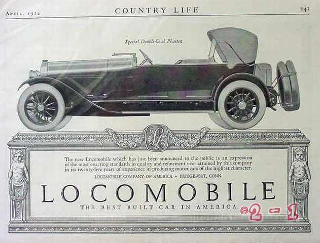 Original old period car magazine vintage ad for LOCOMOBILE COMPANY OF AMERICA of Bridgeport, CT. Special Double Cowl Phaeton, an Expression of the Most Exacting Standards in Quality and Refinement Ever Attained. This 1924 dated fractional page automobile magazine advertisement would display beautifully matted and framed.
