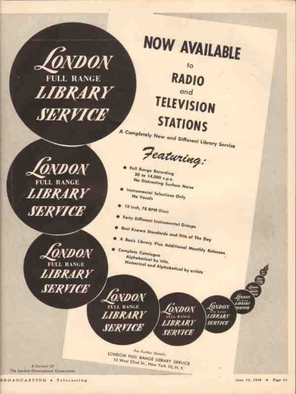 Original old radio TV broadcast equipment trade magazine vintage ad for LONDON GRAMOPHONE CORPORATION of New York City, NY. Full Range Library Service Now Available to Stations. No distracting surface noise, instrumental selections, 10 inch 78 RPM Discs, 40 groups, best known standards and hits of the day, complete catalog by title and artists. This unique old 1948 broadcasting advertisement would display beautifully matted and framed.