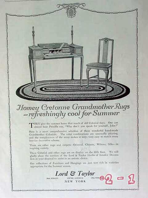 Original vintage magazine ad, LORD & TAYLOR,. "Honey Cretonne Grandmother Rugs". Oriental, Chinese, Wiltons, Silks Rugs, Carpets. Elegant furniture. New York City, NYC. Old 1917 rug advertisement.