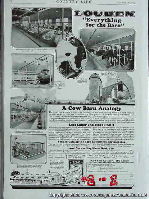 Original vintage magazine ad,THE LOUDEN MACHINERY COMPANY, of 3802 Court Street, Fairfield, IA. Louden "Everything for the Barn". Genuine cow comfort in Louden Stalls and Stanchions, Ayerdale Stock Farm, Bangor, Maine. Louden manure Carrier saves time every day in the year keeping the barn clean. Louden Feed Carrier is cheaper to buy and use than a bushel basket for silage feeding. Louden Tilting Metal Hog Troughs are easy to clean and keep sanitary. Water Bowls pay a higher rate of interest than your bank. Louden Equipment makes a prideful installation, Barn of Thos. Taggert, French Lick, Indiana. Old 1925 dated dairy farming equipment advertisement.