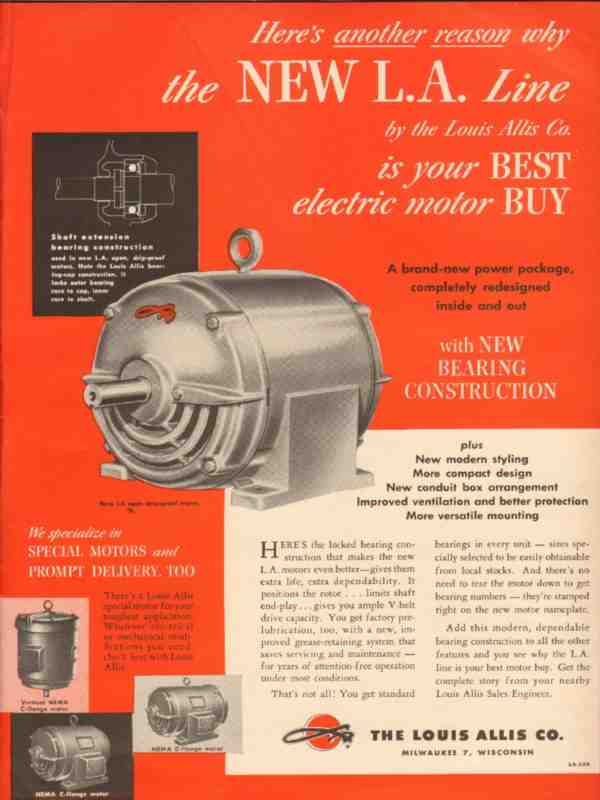 Original vintage oil and gas trade magazine ad for THE LOUIS ALLIS COMPANY of Milwaukee, WI. Another Reason Why the New L.A. Line by the Louis Allis Company is Your Best Electric Motor Buy. Old 1954 petroleum industry oilfield and refinery advertisement.