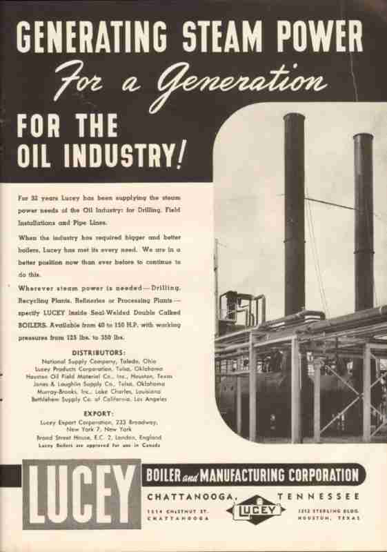 Original oil and gas trade magazine vintage ad for LUCEY BOILER and MANUFACTURING CORPORATION, was located at 1514 Chestnut St., Chattanooga, TN and at 1312 Sterling Building, Houston, TX. Generating Steam Power For a Generation, for the Oil Industry, Drilling, Field Installations and Pipe Lines. Unique 1951 old oilfield petroleum industry power magazine advertisement. Nice graphics.