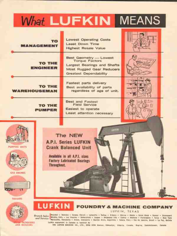 Original oil and gas trade magazine vintage ad for THE LUFKIN FOUNDRY & MACHINE COMPANY of Lufkin, TX. What Lufkin Means to Management, Engineer, Warehouseman, Pumper. A.P.I. Series Lufkin Crank Balanced Unit. This unique 1962 old oilfield petroleum industry pumping equipment magazine advertisement would display beautifully matted and framed.