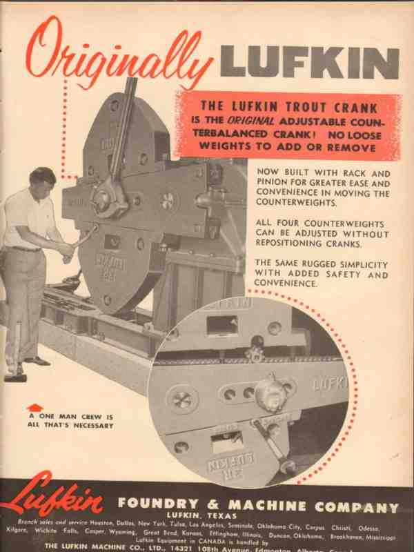 Original oil and gas trade magazine vintage ad for THE LUFKIN FOUNDRY & MACHINE COMPANY of Lufkin, TX. Originally Lufkin, the Lufkin Trout Crank is the Original Adjustable Counterbalanced Crank. Unique 1954 old oilfield petroleum well industry pumping equipment magazine advertisement. Nice graphics.