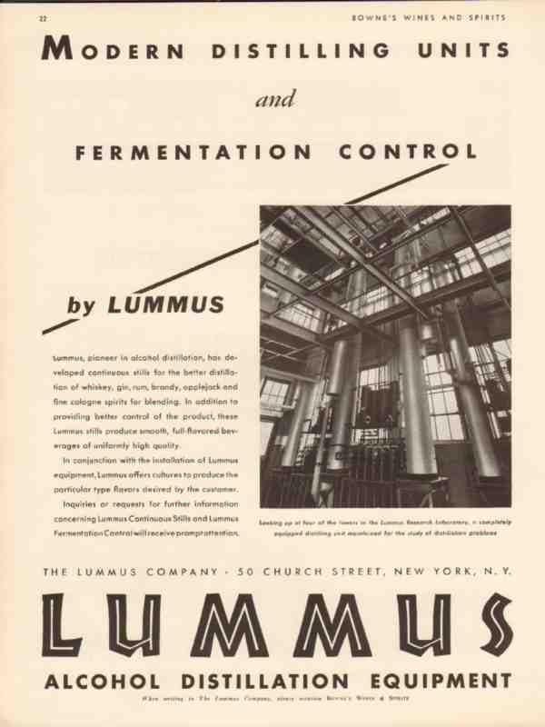 Original vintage whiskey, wine and spirits trade magazine ad for THE LUMMUS COMPANY of New York City, NY. Modern Distilling Units and Fermentation Control by Lummus. Pioneer in alcohol distillation of whiskey, gin, rum, brandy, applejack and fine cologne spirits for blending. Old 1934 rare Post Prohibition era distillery equipment advertisement.