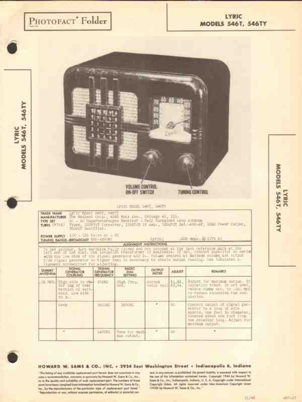 lyric model 546t 546ty 5 tube am radio receiver sams photofact manual