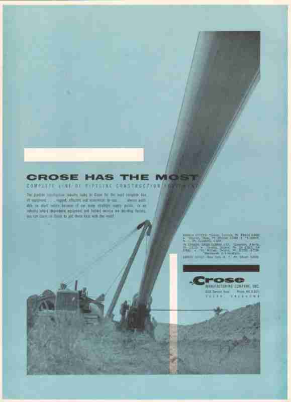 Original oil and gas trade magazine vintage ad for M. J. CROSE MANUFACTURING COMPANY Main office was located at 2765 Dawson Road, Tulsa, OK. Unique 1959 old oilfield petroleum pipeline construction industry equipment magazine advertisement would look sensational matted and framed. Nice graphics.