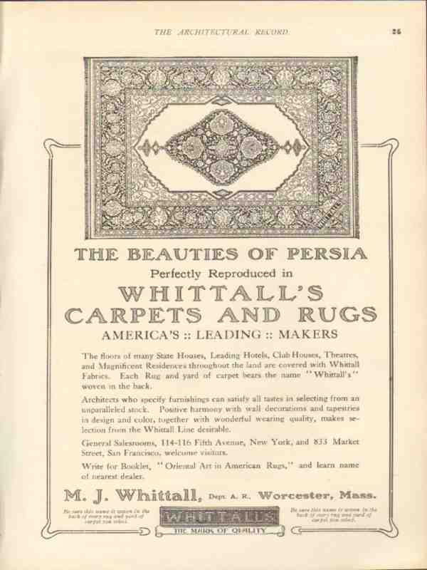 Original vintage architectural trade magazine ad for M. J. WHITALL of Worcester, MA. The Beauties of Persia Perfectly Reproduced with Whittall's Carpets and Rugs. The floors of many State Houses, Leading Hotels, Club Houses, Theaters, and Magnificent Residences throughout the land are covered with Whittall Fabrics. Old 1912 rug advertisement.