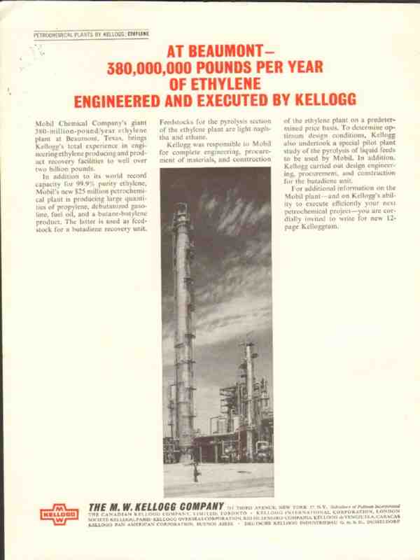 Original oil and gas trade magazine vintage ad for THE M. W. KELLOGG COMPANY. Main office was located at 711 Third Avenue, New York City, NY. Mobil Chemical Company's Giant Plant At Beaumont, Texas, has 380,000,000 Pounds Per Year of Ethylene Engineered and Executed by Kellogg. This unique 1962 old petroleum refining process industry magazine advertisement would display beautifully matted and framed.