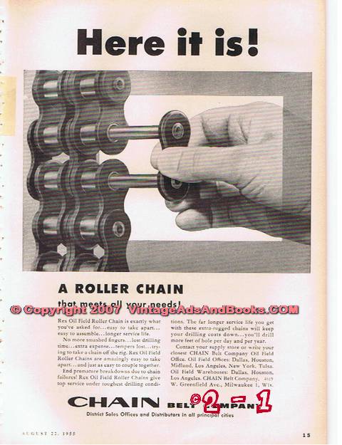 Original oil and gas trade magazine vintage ad for THE M. W. KELLOGG COMPANY of New York City, NY. Petrochemical Processes and Plants Chemical Process Division. Pictured is the Hercules Powder Company plant at Gibbstown, NY. largest facilities for the production of U.S.O. phenol on the eastern seaboard. M.W. Kellogg's experience in petroleum refineries and petrochemical plants include ammonia facilities for Shell Chemical Company and Standard Oil Company of OH. ethylene plants for Imperial Chemical Industries Ltd., and the phenol-from-cumene project for B. A. Shawinigan Company. Unique 1955 old petrochemical industry magazine advertisement. On the reverse side is an ad for CHAIN BELT COMPANY, Milwaukee, WI. Rex Oil Field Roller Chain A Roller Chain that Meets All your Needs! Unique 1955 old oilfield petroleum industry magazine advertisement.