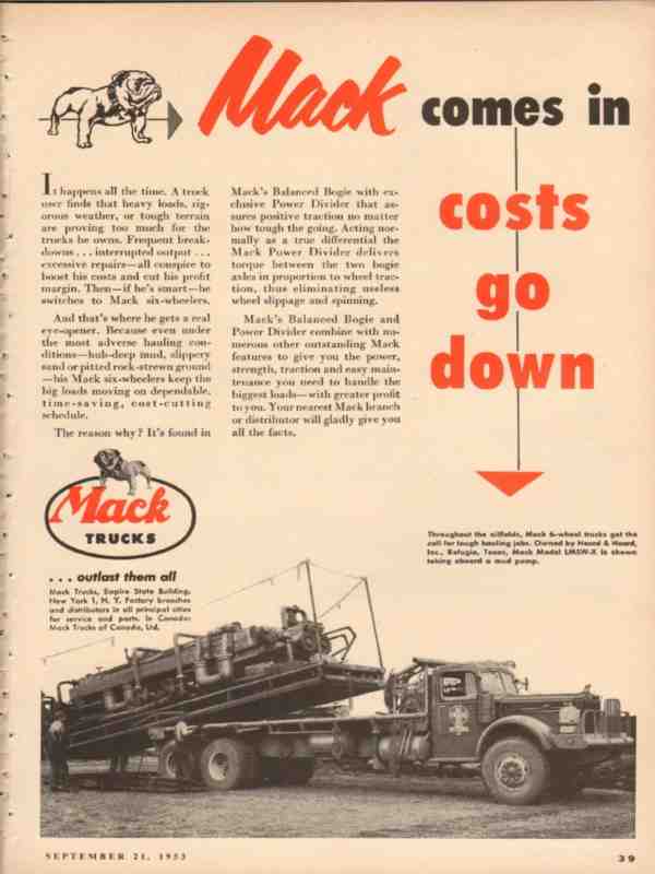 Original old oil and gas trucking industry trade magazine vintage ad for MACK TRUCKS of New York City, NY. Owned by Heard and Heard, Inc. of Refugio, Texas, Mack Truck Model LMSW-X is shown taking aboard a mud pump. Mack Comes in, Costs Go Down. This 1953 petroleum transportation magazine advertisement would display beautifully matted and framed.