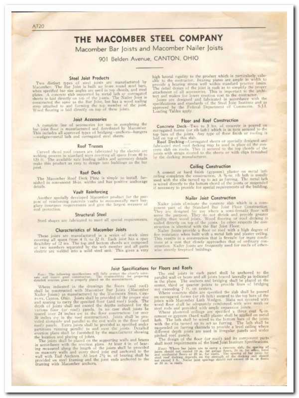 Original roofing trade vintage catalog for THE MACOMBER STEEL COMPANY. Main office was located at 901 Belden Avenue, Canton, OH. Manufacturers of bar and nailer joists, roofing trusses, decks, floor and roof construction. This unique 1933 old one page technical building brochure would display fantastic matted and framed. A marvelous addition to your retro architectural and engineering library. Light damp stain on top and bottom page edges.