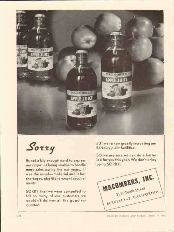 Original vintage food packing industry trade magazine ad for MACOMBERS, INC. of Berkeley, CA. Sorry is not a big enough word to express our regret at being unable to handle more sales during the war years. It was the usual material and labor shortages, plus Government requirements. But we're now greatly increasing our Berkeley plant facilities. Pictured is Macomber's Apple Juice. Old 1946 canning and packaging advertisement.