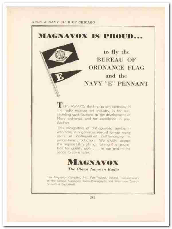 Original WW2 wartime vintage ad for MAGNAVOX COMPANY. Proud to Fly Bureau of Ordnance Flag and Navy E Pennant. This award, the first to any company in the radio receiver set industry, is for outstanding contributions to the development of Navy ordnance and for excellent in production. We gladly accept the responsibility of maintaining this reputation for quality work, in war and in the peace to come later. Manufacturers of the famous Magnavox Radio-Phonographs and Illustravox Sound-Slide-Film Equipment.