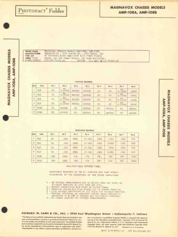 Vintage MAGNAVOX models AMP-108A and AMP-108B 6 tube audio amplifier. Original old Sams Photofact manual includes schematic, layouts, voltage & resistance readings, parts list. 4 pages. Dated 1948.