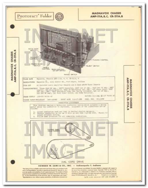 Vintage MAGNAVOX models AMP-111A, AMP-111B, AMP-111C, CR211A and CR211B 19 tube Superheterodyne AM FM radio amplified tuner.. Original old Sams Photofact manual includes schematic, layouts, alignment info, repair parts list. 13 pages. Dated 1949. Magnavox Company of Fort Wayne, IN. This manual would make a sensational accompaniment to your vintage audio equipment.