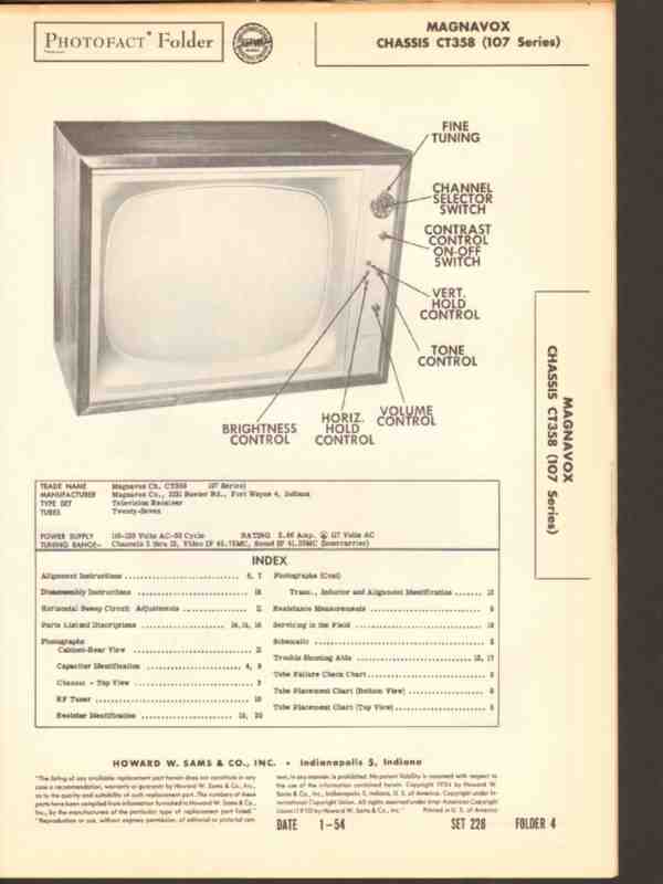 Vintage MAGNAVOX models CT358 (107 series) 27 tube TV television receiver. Original old Sams Photofact manual includes schematic, layout, alignment instructions, voltage & resistance test chart, repair parts list. 20 pages. Dated 1954. This manual would make a sensational accompaniment to your classic video TV equipment.