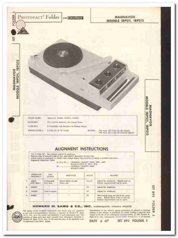 Vintage MAGNAVOX models 1RP211 and 1RP212 Portable battery operated AM radio receiver with manual record player. Original old Sams Photofact manual includes schematic, parts layout, alignment info, repair parts list and descriptions. 6 pages. Dated 6-1967. Manufactured by Magnavox Company, of Fort Wayne, IN. This manual would make a sensational accompaniment to your retro phonograph equipment.