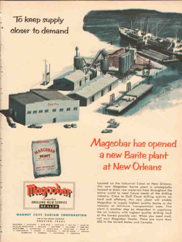 Original oil and gas trade magazine vintage ad for MAGNET COVE BARIUM CORPORATION of Houston, TX.  Magcobar Has Opened a New Barite Plant at New Orleans to Keep Supply Closer to Demand.  Located on the Industrial Canal. Unique 1954 old oilfield petroleum industry drilling mud equipment magazine advertisement.  Nice graphics.