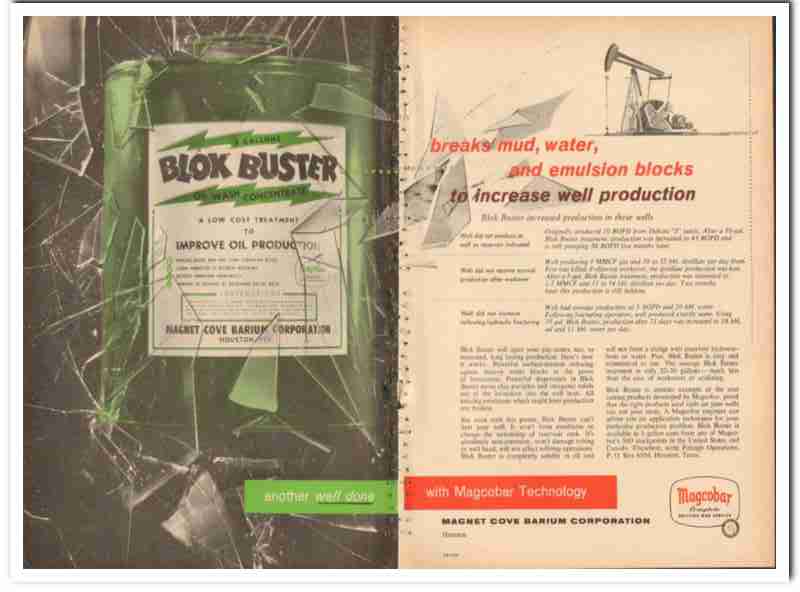 Original oil and gas trade magazine vintage ad for MAGNET COVE BARIUM CORPORATION.  Main office was located in Houston, TX. MagCoBar Blok Buster for oil well production improvement.  Breaks mud, water, and emulsions blocks. This unique 1959 old oilfield petroleum drilling industry magazine advertisement would display beautifully matted and framed. Two page gatefold advertisement.