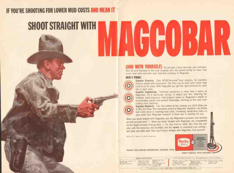 Original oil and gas trade magazine vintage ad for MAGNET COVE BARIUM CORPORATION. Main office was located in Houston, TX. Magcobar Lower Mud Costs. Give all your business to the mud company with the proved ability to lower mud costs, well after well! Superior products, engineering, research. Consistently hit the target of lower drilling costs. This unique 1962 old oilfield petroleum drilling industry magazine advertisement would display beautifully matted and framed. Nice graphics. Two page gatefold advertisement.