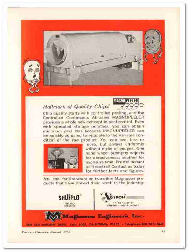 Original 1968 potato chip trade magazine vintage ad for MAGNUSON ENGINEERS, INC. Main office and factory was located at Ten Ten Timothy Drive, San Jose, CA. MagnuPeeler. Hallmark of Quality Chips! Chip quality starts with controlled peeling, and the Controlled Continuous Abrasive Magnupeeler provides a whole new concept in peel control. This old dated red one page snack food manufacturing advertisement would display beautifully matted and framed. (zi431)