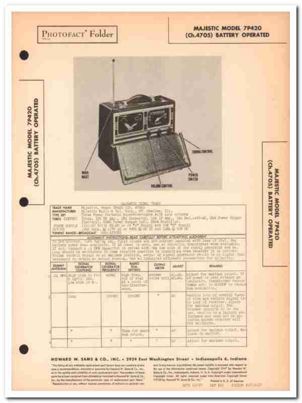 Vintage Radio Service Manual - MAJESTIC model 7P420 (Chassis No. 4705) 5-tube battery operated Superheterodyne AM radio receiver. Manufactured by Majestic Radio and Television Corp., of St. Charles, IL. Dated 1947. 4 pages.Original old Sams Photofact manual includes schematic, layout, alignment instructions, voltage & resistance test chart, repair parts list and description. This manual would make a sensational accompaniment to your retro audio equipment.
