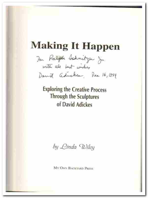 Hard covered book titled MAKING IT HAPPEN Exploring the Creative Process Through the Sculptures of David Adickes. written by Linda Wiley, SIGNED & inscribed by David Adickes to Ralph Schnitzer Jr, My Own Backyard Press, 150 pages, with dust jacket.