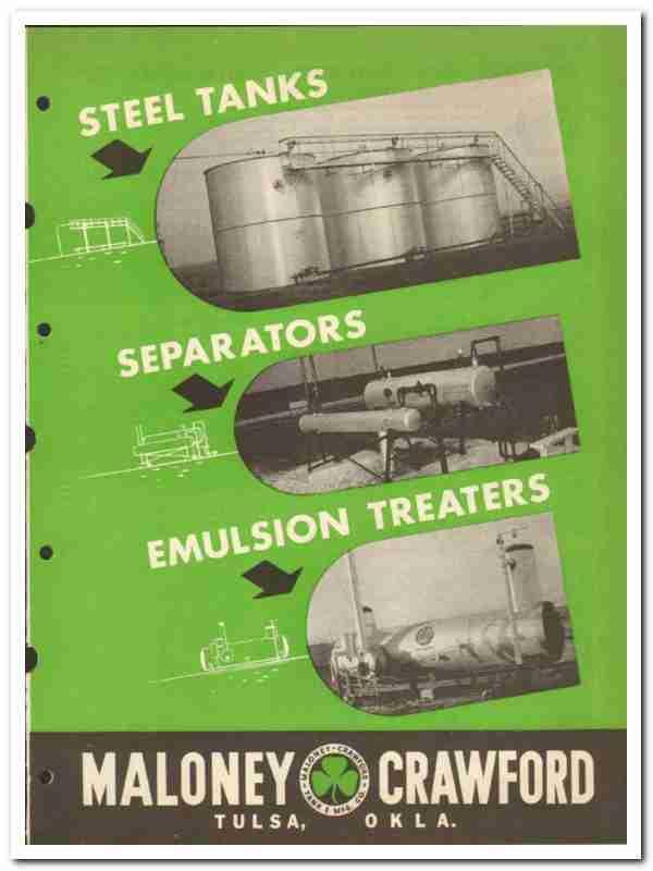 Original 1950 Oil and Gas trade vintage catalog for the MALONEY-CRAWFORD TANK & MANUFACTURING COMPANY. Main office and plant was located at 38 North Peoria Avenue, Tulsa, OK.