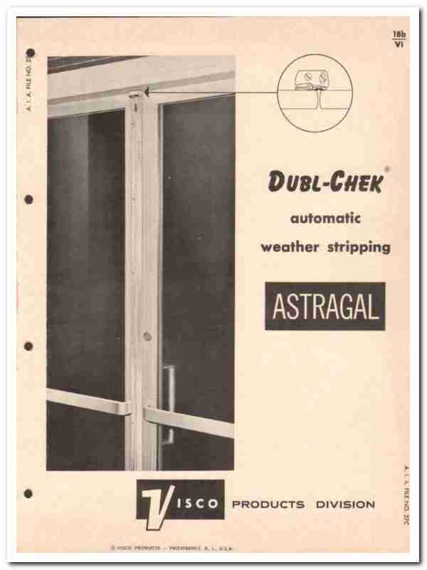 Original hardware trade vintage catalog for MANDIST INC.  Visco Products Division.  Main office was located in Providence, RI.  Manufacturers of Dubl-Chek weatherstrip. Astrogal allows no visible light between the door regardless of how tightly or loosely the doors fit.  Components, applications, action and details provided.  Automatic weather stripping. This unique 1962 old four page building construction brochure would be a marvelous addition to your retro architectural design and engineering library. Pages are loose and contain small amount of residual glue on edge.