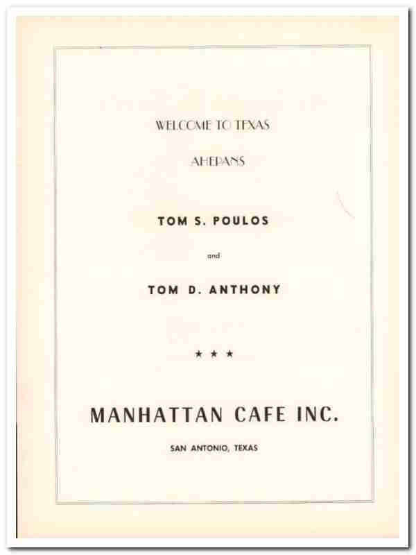 Original 1953 Greek-American business trade magazine vintage ad for the MANHATTAN CAFE, INC. The restaurant was located on Houston Street, in San Antonio, Texas, near the Majestic Theater. Welcome To Texas Ahepans! Tom S. Poulos and Tom D. Anthony, Owners.