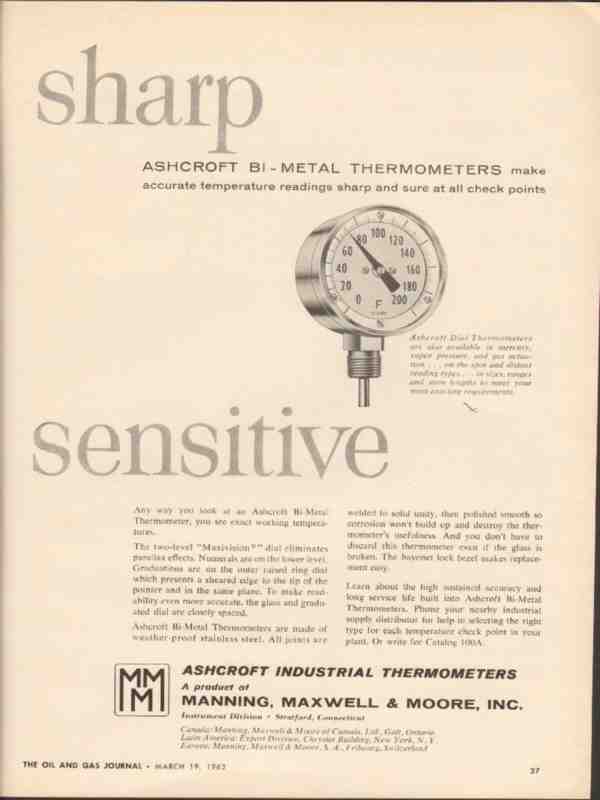 Original oil and gas trade magazine vintage ad for MANNING, MAXWELL & MOORE, INC. of Stratford, CT. Ashcroft Bi-Metal Thermometers Make Accurate Temperature Readings Sharp and Sure At All Check Points. Also available in mercury, vapor pressure, and gas action. This unique 1962 old petroleum refining instruments magazine advertisement would display beautifully matted and framed.