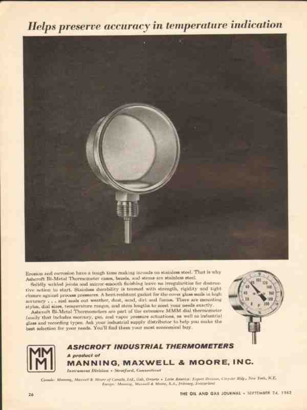 Original oil and gas trade magazine vintage ad for MANNING, MAXWELL & MOORE, INC. of Stratford, CT. Instrument Division. Ashcroft Industrial Thermometers Helps Preserve Accuracy in Temperature Indication. This unique 1962 old petroleum refining instrument equipment magazine advertisement would display beautifully matted and framed. Nice graphics.