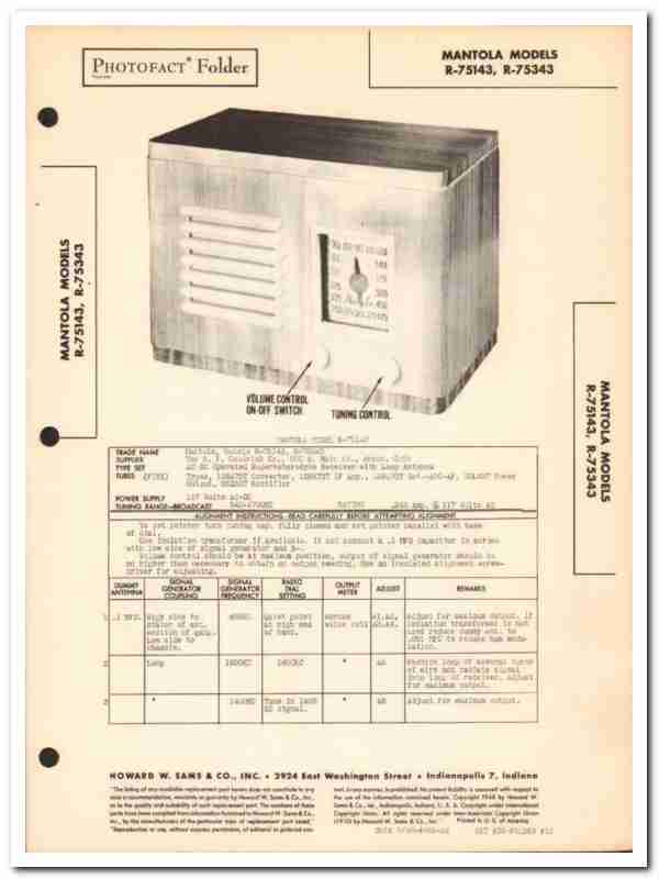 mantola model r-75143 r-75343 5-tube am radio sams photofact manual