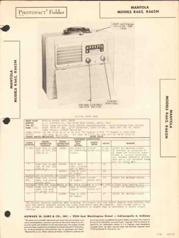 Vintage MANTOLA models R662 and R662N Superheterodyne 6 tube AM radio receiver. Original old Sams Photofact manual includes schematic, layout, alignment instructions, voltage & resistance test charts, repair parts list and description. Dated 1946. 4 pages. B.F. Goodrich Company of Akron, OH. This manual would make a sensational accompaniment to your classic retro radio equipment.