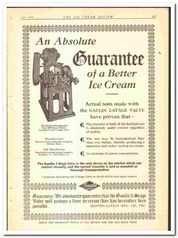 Original 1924 ice cream trade vintage magazine ad for the MANTON-GAULIN MANUFACTURING COMPANY, INC. Main office and plant were located in Boston, MA.