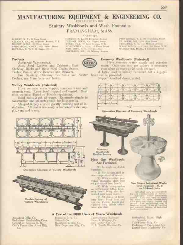 Original plumbing trade vintage catalog for MANUFACTURING EQUIPMENT & ENGINEERING COMPANY, was located in Framingham, MA. Manufacturers of Sanitary Washbowls and Wash Fountains. Products shown include MEECO, Victory and Economy Washbowl. Used at Amoskeag Manufacturing, Bethlehem Shipbuilding, Colt's Patent Fire Arms Manufacturing, Grinnell, Houghton Mifflin, Pennsylvania Railroad, REO Motor Car Company, Taft-Pierce and Underwood Typewriter. Unbound from a large 1931 architectural catalog, this unique old one page technical brochure would display beautifully matted and framed. Nice graphics. A fantastic addition to your retro industrial plumbing collection. Slight damp stain on outer edge.