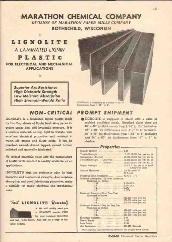 Original insulation trade vintage catalog for MARATHON CHEMICAL COMPANY, was located in Rothschild, WI. Manufacturers of Lignolite laminated lignin plastic for electrical and mechanical applications. Superior arc resistance, high dielectric strength. Division of Marathon Paper Mills Company. Disbound from a large 1944 electrical construction materials book, this unique old one page technical specifications brochure would display wonderfully matted and framed. A marvelous addition to your retro electric equipment library.