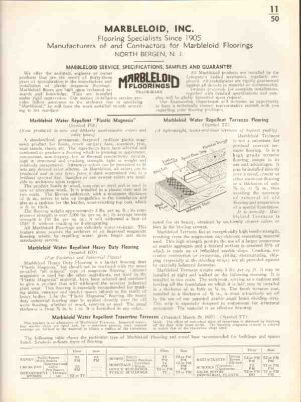 Original flooring trade vintage catalog for MARBLELOID, INC. was located in North Bergen, NJ. Manufacturers of Water Repellent Terrazzo Flooring. Service, Specifications, Samples and Guarantee. High grade flooring. Installed by skilled mechanics, regularly employed. Disbound from a large 1938 floor materials catalog, this unique old one page technical specifications brochure would display wonderfully matted and framed. A marvelous addition to your retro flooring construction library.