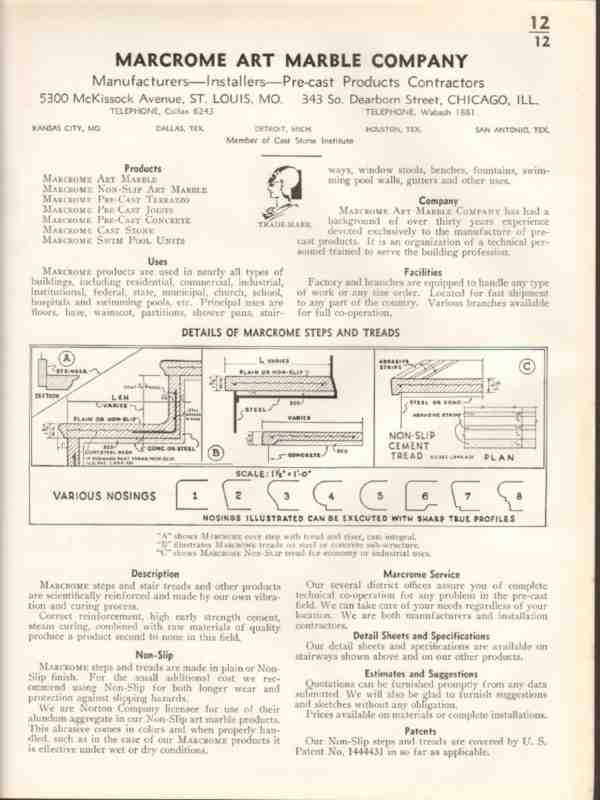 Original stone trade vintage catalog for MARCROME ART MARBLE COMPANY. Main office and factory was located at 5300 McKissock Avenue, St Louis, MO, and at 343 South Dearborn Street, Chicago, IL. Manufacturers, Installers of Pre-Cast Products Contractors. Details of Marcrome Steps and treads. Products include Marcrome art marble, terrazzo, cast stone and swim pool units. Unbound from a large 1938 architectural catalog, this unique old one page technical brochure would display fantastic matted and framed. Nice graphics. A fabulous addition to your retro stone library.