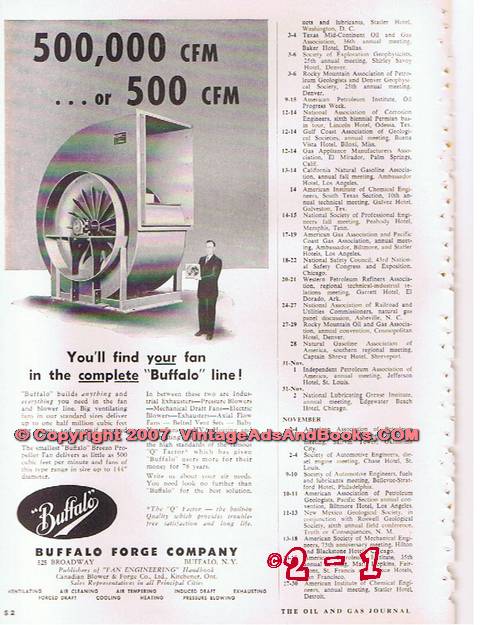 Original oil and gas trade magazine vintage ad for MARLOW PUMPS of Ridgewood, NJ.  Division of BELL & GOSSETT COMPANY.  Marlows are Durable!  Additional profits for operators everywhere are realized by recovering good, usable oil from basic sediment and water.  Marlow Self-Priming Centrifugal Pumps. Unique 1955 old oilfield petroleum industry pump equipment magazine advertisement. On the reverse side is a fractional page ad for BUFFALO FORGE COMPANY of Buffalo, NY.  500,000 CFM or 500 CFM You'll find Your Fan in The complete Buffalo Line!  Ventilating, Air Cleaning, Air Tempering, Induced Draft, Exhausting, Forced Draft, Cooling, Heating, Pressure Blowing. Old 1955 petroleum industry magazine advertisement. Approximate page size  9 x 12 inches.