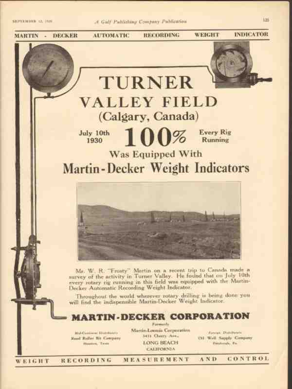 Original oil and gas trade magazine vintage ad for MARTIN-DECKER CORPORATION of Long Beach, CA. Formerly Martin-Loomis Corporation. Turner Valley Field in Calgary, Canada is 100 Percent Every Rig Equipped with Martin-Decker Weight Indicators. Mr. W.R. Frosty Martin surveyed the activity in Turner Valley. Unique 1930 old oilfield petroleum well industry equipment magazine advertisement. Nice graphics.