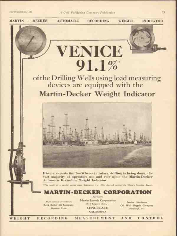 Original oil and gas trade magazine vintage ad for MARTIN-DECKER CORPORATION of Long Beach, CA. Formerly Martin-Loomis Corporation. In Venice, 91.1 Percent of the Drilling Wells Using Load Measuring Devices Are Equipped with the Martin-Decker Weight Indicator. Unique 1930 old oilfield petroleum well industry equipment magazine advertisement. Nice graphics.