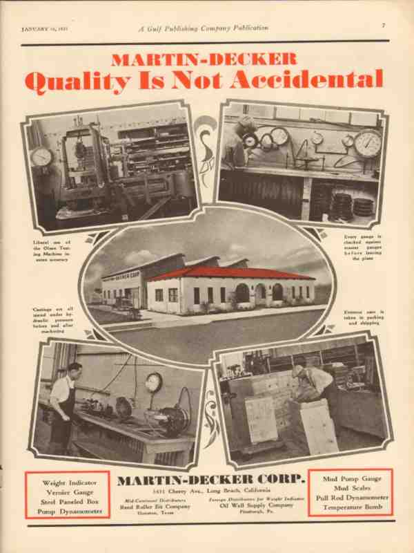 Original oil and gas trade magazine vintage ad for MARTIN-DECKER CORPORATION of Long Beach, CA. Martin-Decker Quality Is Not Accidental. Use of the Olsen Testing Machine insures accuracy. Every gauge is checked against master gauges before leaving the plant. Interior shop photos shown. This unique 1931 old petroleum oilfield drilling and pumping equipment magazine advertisement would display beautifully matted and framed. Nice graphics.