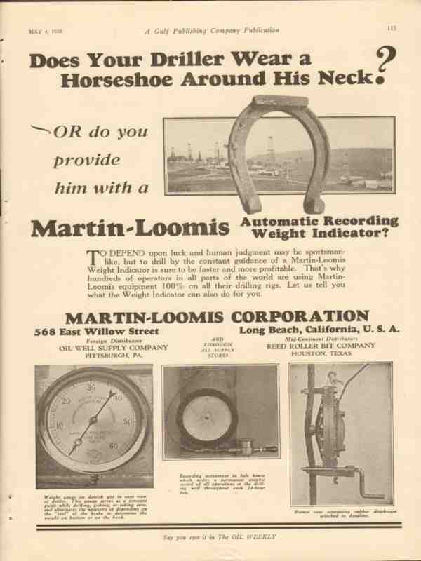 Original oil and gas trade magazine vintage ad for MARTIN-LOOMIS CORPORATION, was located at 568 East Willow Street, Long Beach, CA. Does Your Driller Wear a Horseshoe Around His Neck or Do You Provide Him With a Martin-Loomis Automatic Recording Weight Indicator? Weight gauges for oil derricks. Unique 1928 old oilfield petroleum drilling industry equipment magazine advertisement. Nice graphics.